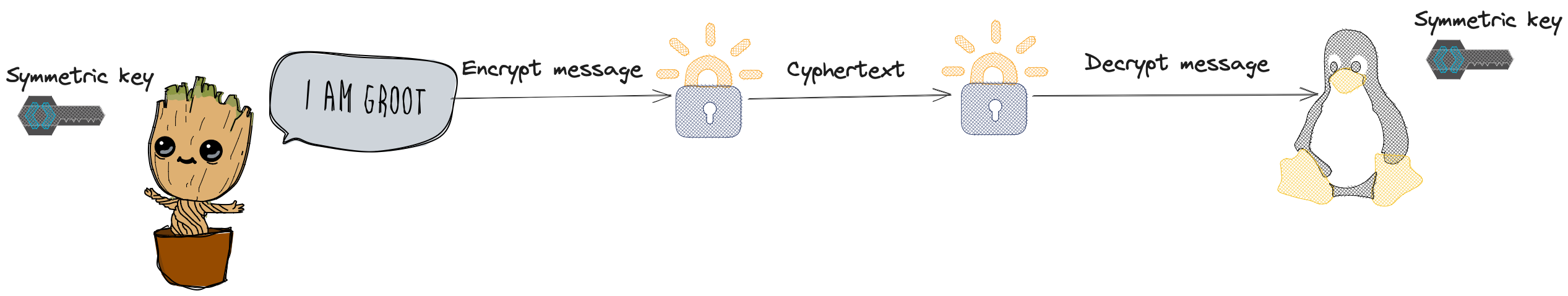 The concept is really simple and detailed in the diagram below. Both parties involved in the communication use the same key (hence the name symmetric) to encrypt and decrypt the payload. There are various algorithms that are used, for example AES.